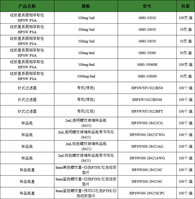 本次应用参考SNT 1982-2007 进出口食品中氟虫腈残留量检测方法 气相色谱-质谱法,使用HPSW PSA固相萃取柱进行测定。PSA是基于高纯球形硅胶的乙二胺-N-丙基SPE柱,可以有效去除食品基质中影响检测的脂肪酸、有机酸、色素、金属离子等干扰物,常用于检测蔬菜、水果中的农药残留等。
